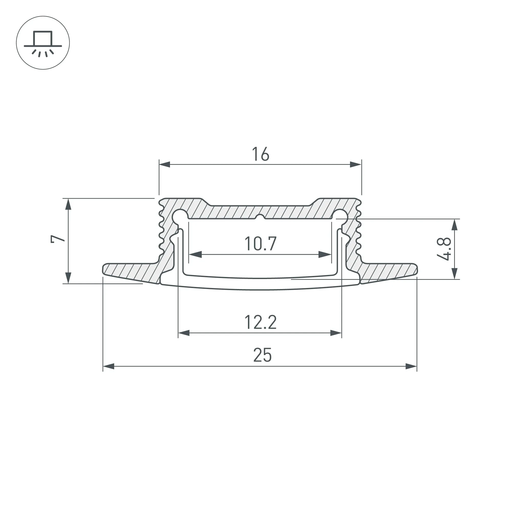 Алюминиевый анодированный профиль для светодиодных лент и линеек. Габаритные размеры (L×W×H): 2000x25x7 мм, паз для установки 16 мм. Ширина площадки для ленты 10,7 мм. Экраны, заглушки и другие аксессуары приобретаются отдельно. Цена за 1 метр.