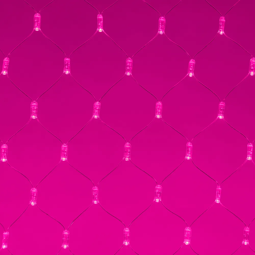 Светодиодная сеть Classic. 2000x1500 (длина 2000 мм, высота 1500 мм). Цвет свечения РОЗОВЫЙ. 288 светодиодов размером 7 мм со статическим и 8 динамическими эффектами свечения с резким световым рисунком (прозрачная вогнутая линза). Провод прозрачный, ПВХ. Питание 230 В, Мощность 18 Вт,защита IP65, применение в помещении и на улице под навесом Аксессуары для подключения и выбора режима свечения в комплекте.
