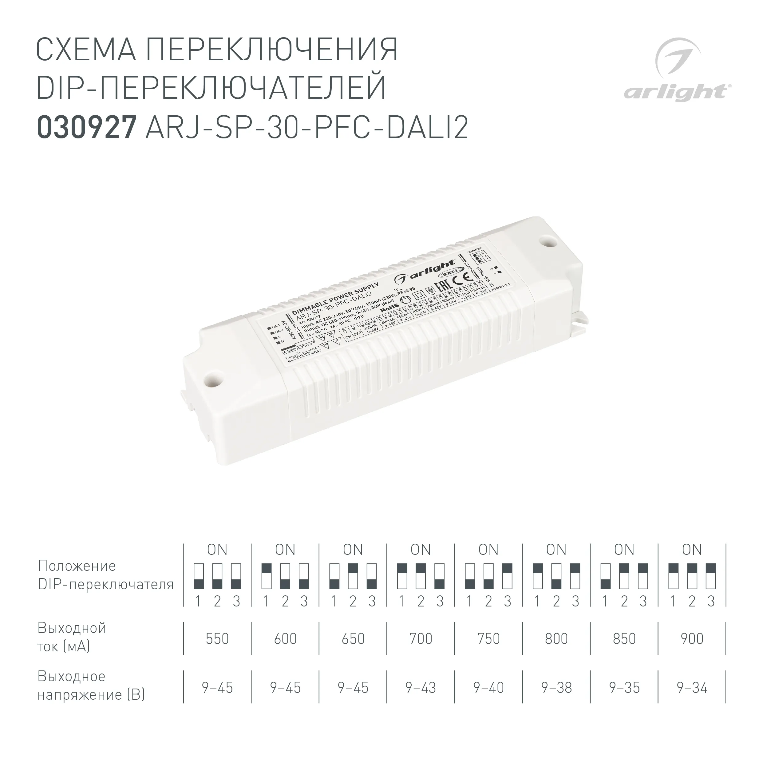 Блок питания ARJ-SP-30-PFC-DALI2 (30W, 550-900 mA) (Arlight, IP20 Пластик, 5 лет)