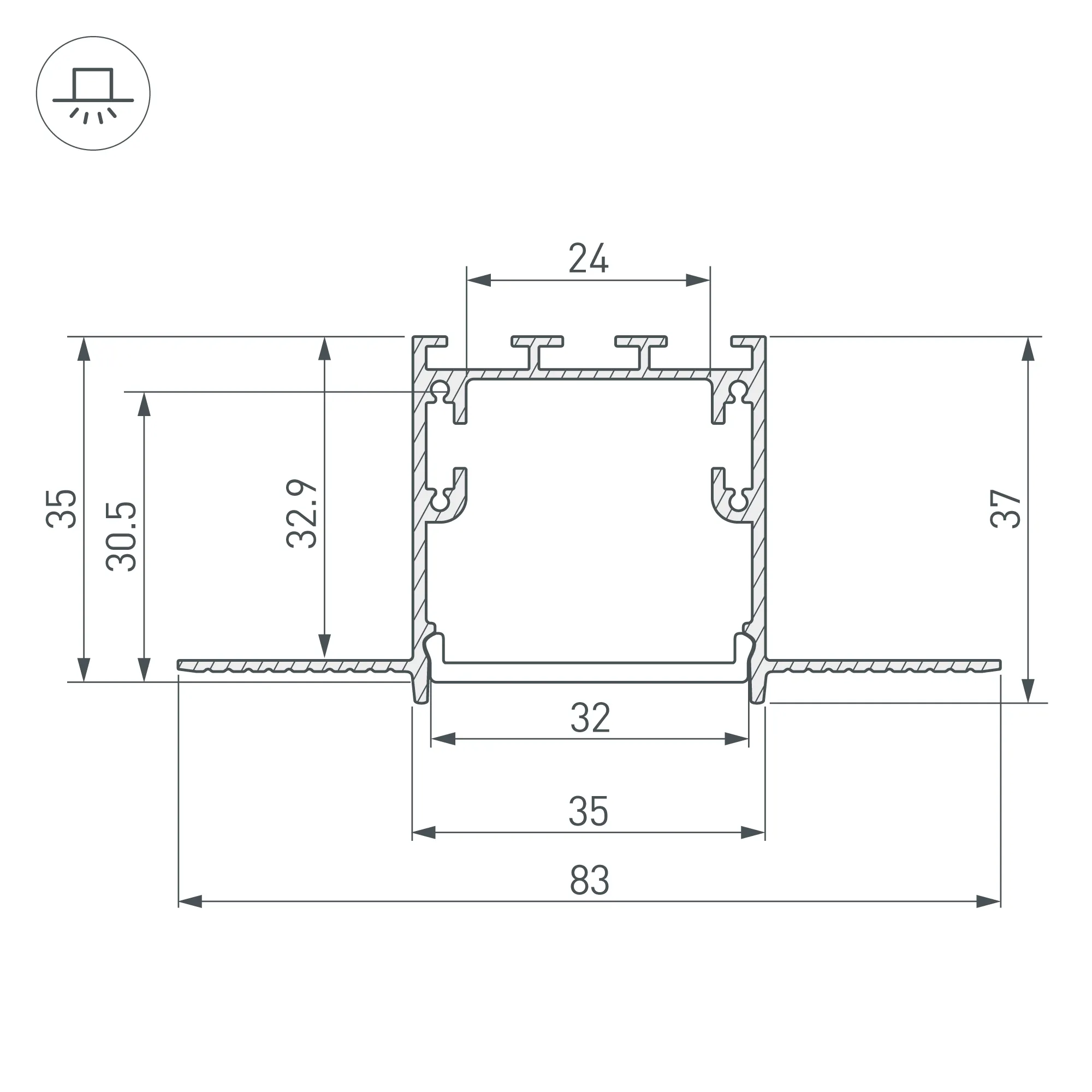 Комплект с экраном. Алюминиевый анодированный профиль для светодиодных лент и линеек. Габаритные размеры (L×W×H): 2500x83x35 мм. Паз для установки 35х35 мм. Ширина площадки для ленты 24 мм. Аксессуары приобретаются отдельно. Цена за комплект.