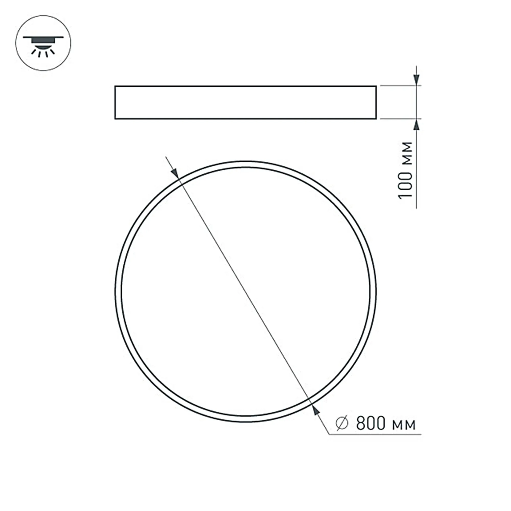Накладной интерьерный светильник. Мощность 94 Вт, св. поток 7620 лм, 80 лм/Вт, дневной 4000 K, CRI>80, угол 100°, напряжение питания 230 В. Белый круглый корпус из алюминия, степень защиты IP20. Призматический акриловый рассеиватель. Размер: диаметр 800 мм, высота 100 мм. Монтаж накладной. Драйвер 28-42 В, 1200 мА (2 шт.), пульсация <2%.