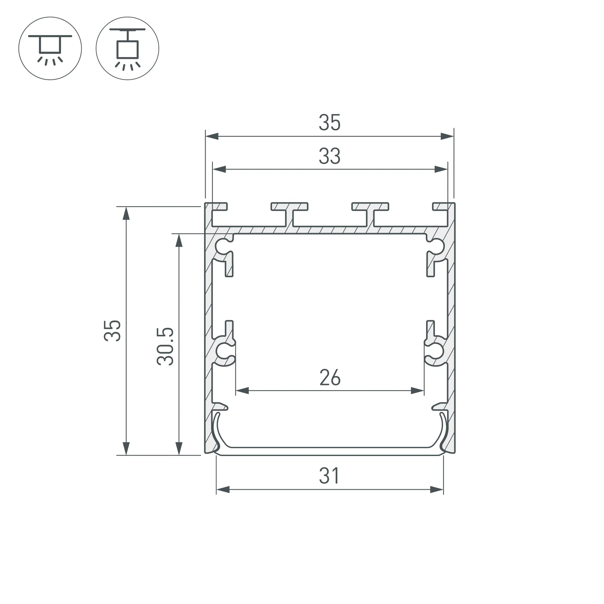Алюминиевый анодированный профиль для светодиодных лент и линеек. Габаритные размеры (L×W×H): 2000x35x35,5 мм. Ширина площадки для ленты 26 мм. Экраны, заглушки и другие аксессуары приобретаются отдельно. Цена за 1 метр.