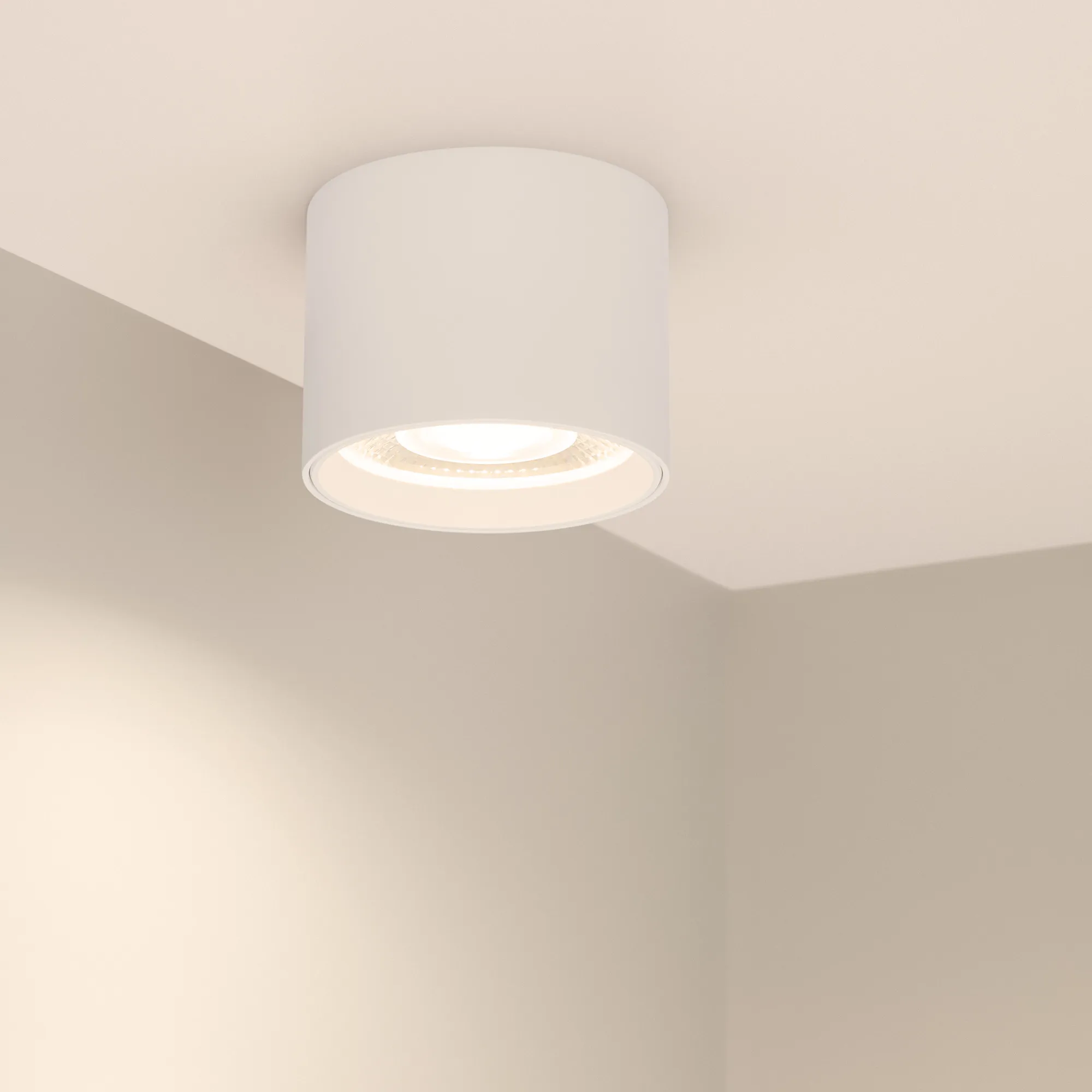 Накладной интерьерный светильник. Мощность 10 Вт, св. поток 780 лм, 78 лм/Вт, теплый 3000 K, CRI>90, угол 24°, напряжение питания 230 В. Белый круглый корпус, степень защиты IP54. Размер: диаметр 77 мм, высота 65 мм. Монтаж накладной. Драйвер встроенный, пульсация <5 %.