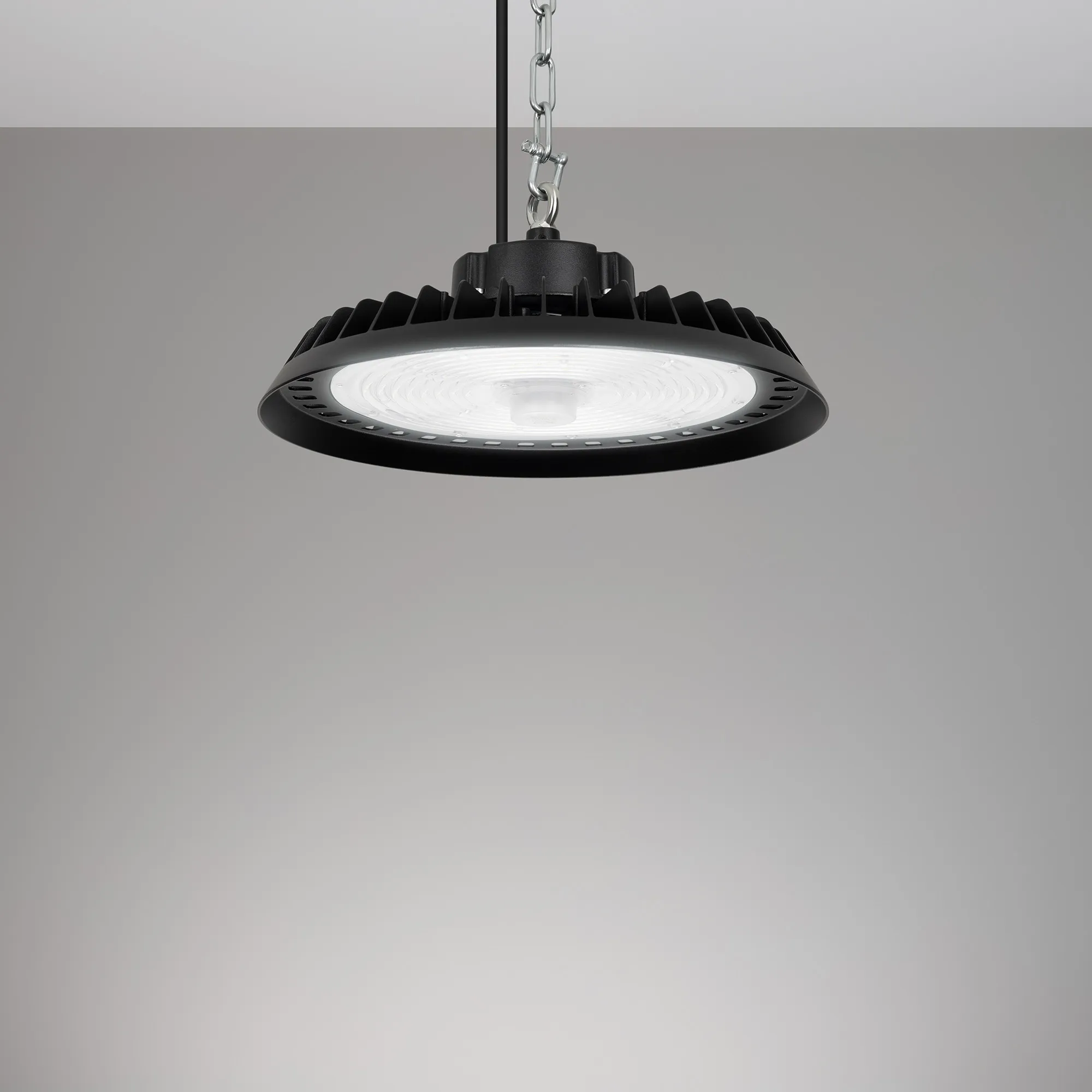 Светильник для освещения складских и промышленных помещений. Мощность 200W, напряжение питания AC 120-270V/50Hz. CRI 80. Тип светодиодов SMD2835, с групповой оптической линзой. Цвет свечения ДНЕВНОЙ 5000K, световой поток 30000 Lm, угол рассеивания 90°. Доступно управление по протоколу 0-10В. Цвет корпуса черный, линза из поликарбоната, степень влагозащиты IP65, ударопрочность IK08. Габариты Ф350xH140мм. Рым-болт в комплекте. Датчик настраивается с помощью пульта 052018 (один на все датчики). Длина кабеля питания 900 мм.