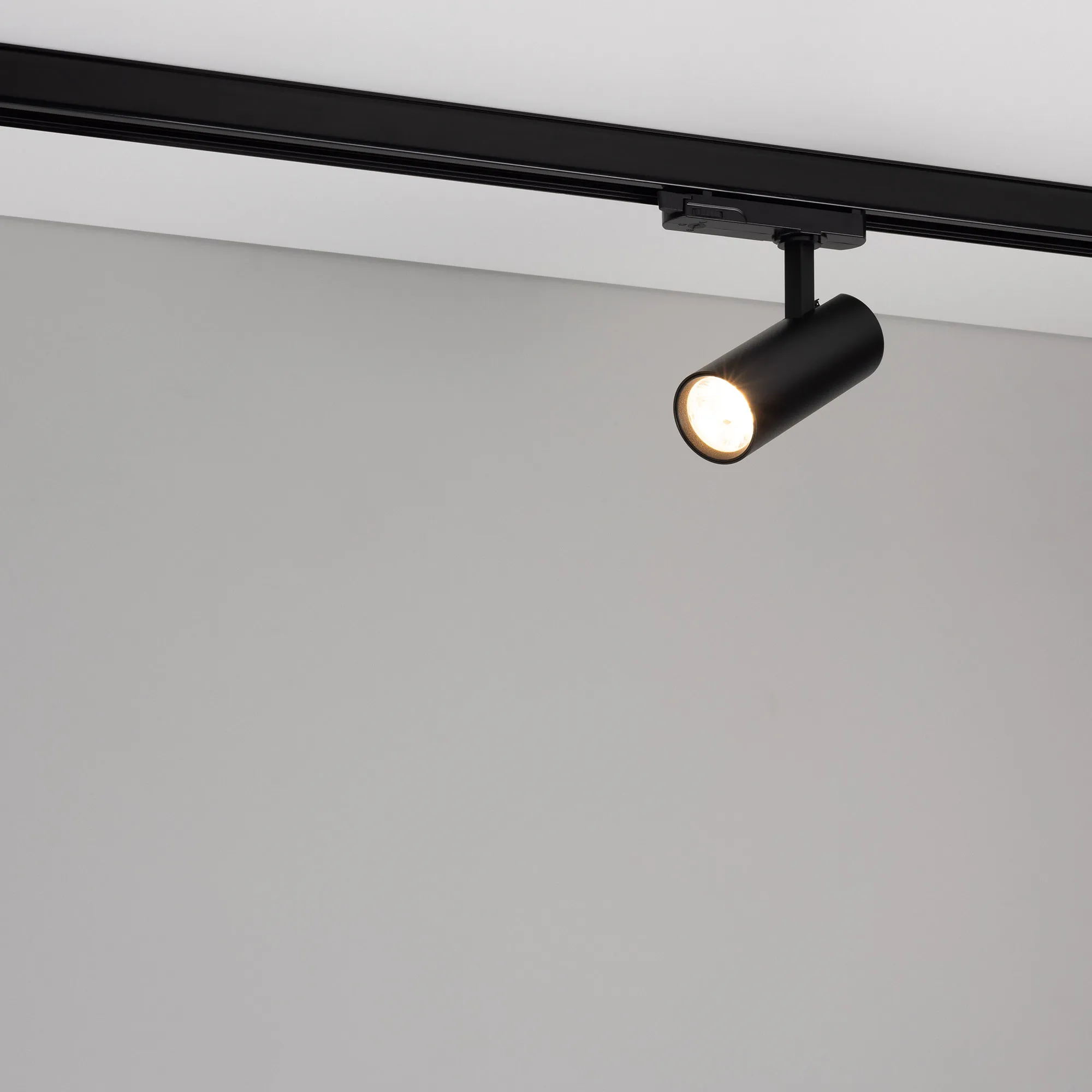 Светильник для треков/шин 4 провода. Мощность 10 Вт, св. поток без решетки honeycomb 1000 лм, 100 лм/Вт, с решеткой honeycomb 660 лм, 66 лм/Вт, теплый 3000 K, CRI>90, угол 55°, напряжение питания 230 В. Черный круглый корпус из алюминия, материал линзы PMMA, степень защиты IP20. Размер: диаметр 55 мм, длина световой части 141 мм. Монтаж на трек 3-фазный. Драйвер встроенный 25-42 В, 250мА., пульсация <5%.
