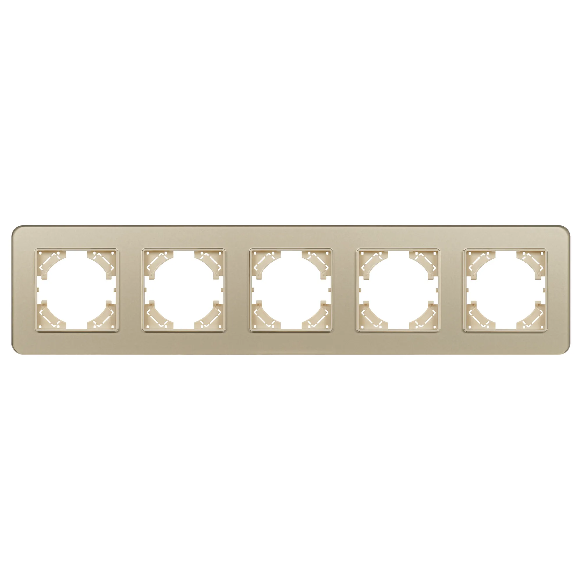 Рамка стеклянная на 5 постов, под встраиваемый механизм. Цвет - золотой с Soft-Touch покрытием. Уровень герметичности IP20. Ориентация монтажа - горизонтальная (основным ориентиром служат посадочные выступы для накладки механизма). Габаритные размеры: длина 370 мм, ширина 86 мм, высота 7 мм. Гарантийный срок 12 мес.